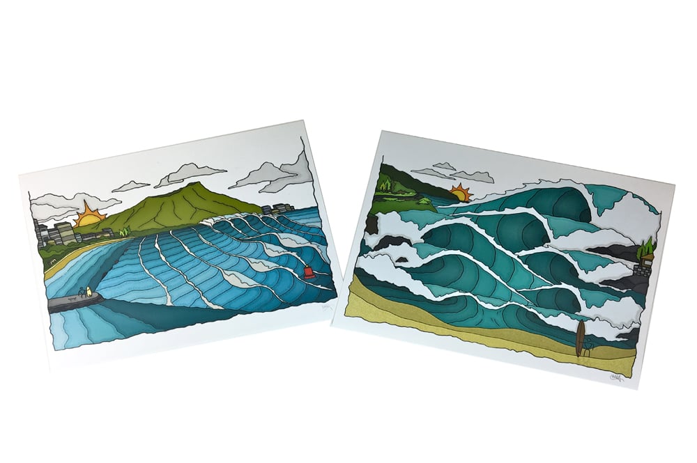 "South Shore Summer" and "Waimea Bay Winter" By Mackenzie Yoshida.